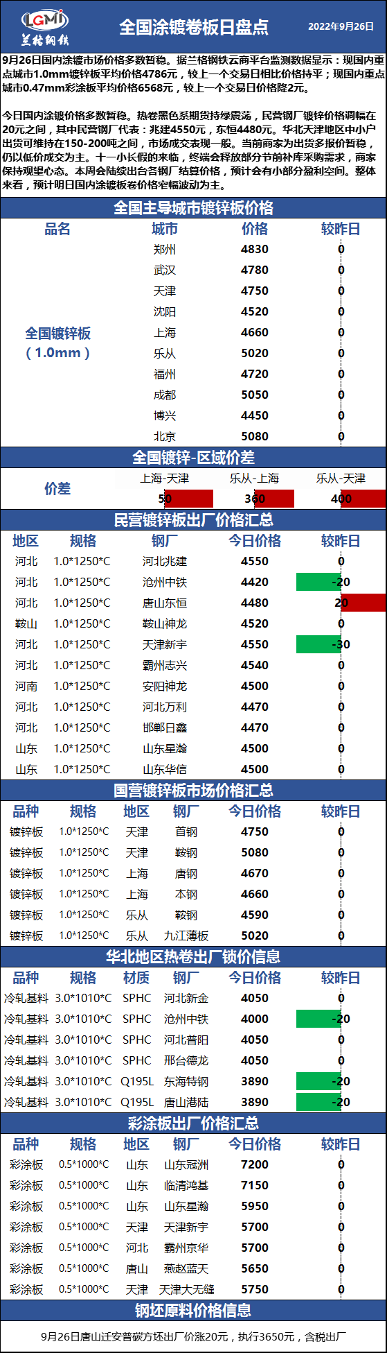 - 9月26日全国钢厂建筑钢材调价汇总2022/9/26