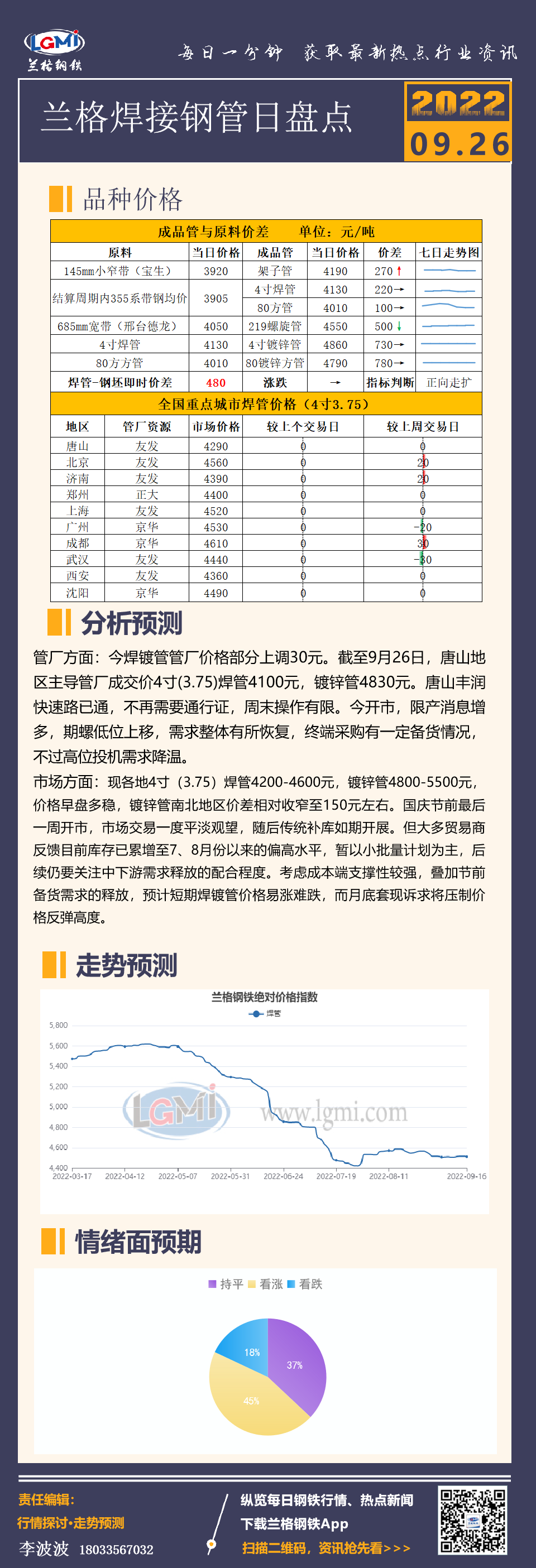 - 兰格焊管周盘点:利空落地 供需快速走旺 预期谨慎乐观2022/9/23