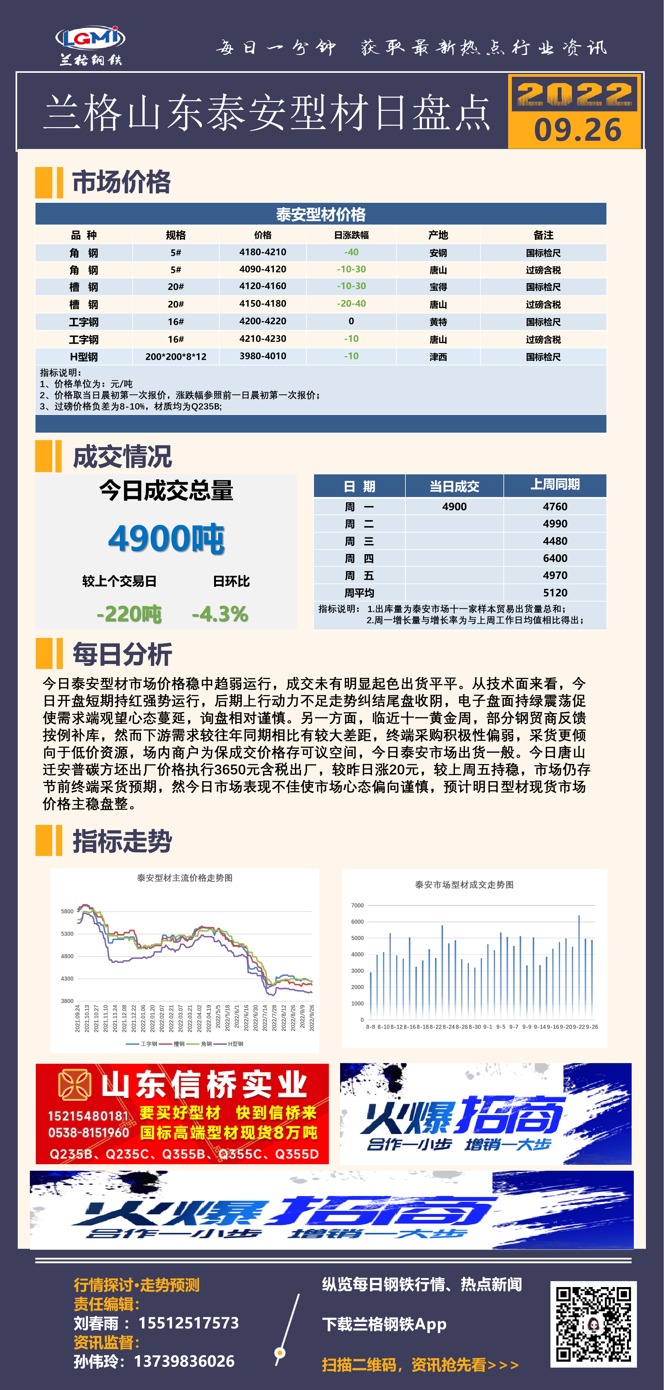 - 泰安型材日盘点:价格主稳偏弱 期螺区间震荡 交投平平2022/9/26