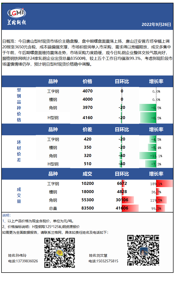 - 唐山型材日盘点: 价格主稳 部分资源降后回调 市场询单入市显积极2022/9/26