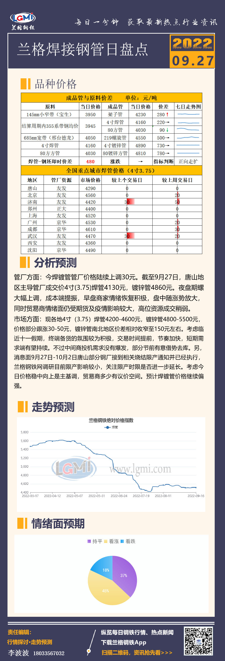 - 兰格焊管周盘点:利空落地 供需快速走旺 预期谨慎乐观2022/9/23