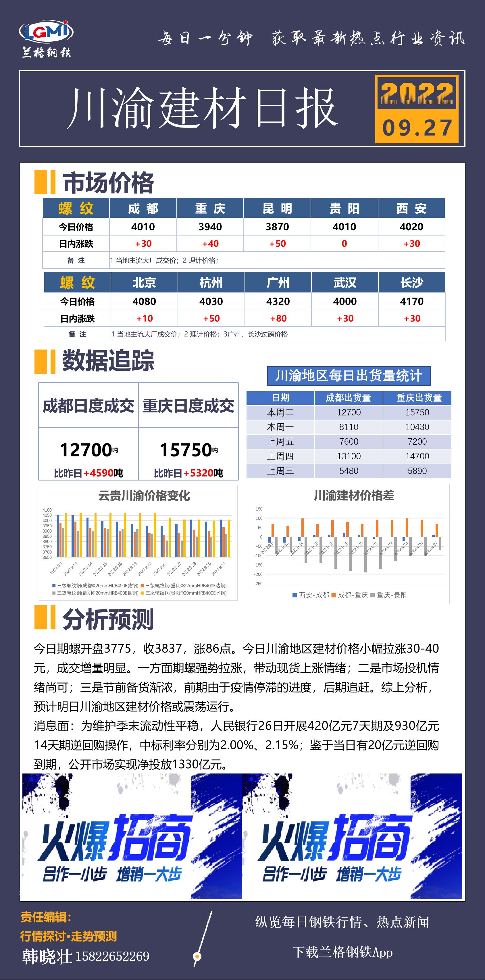 - 川渝地区建材价格小幅上涨 成交增量2022/9/27