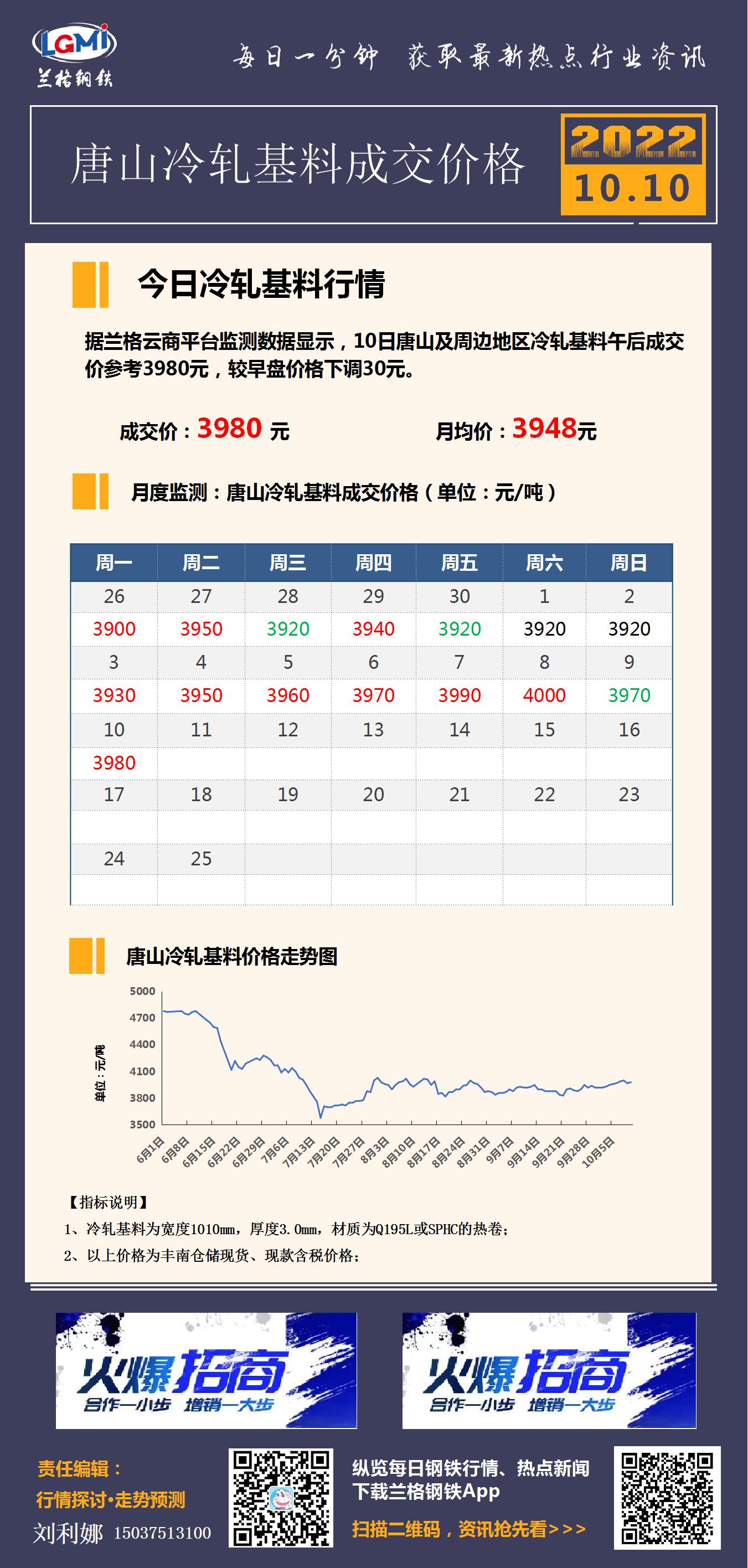 10月10日唐山冷轧基料成交价格