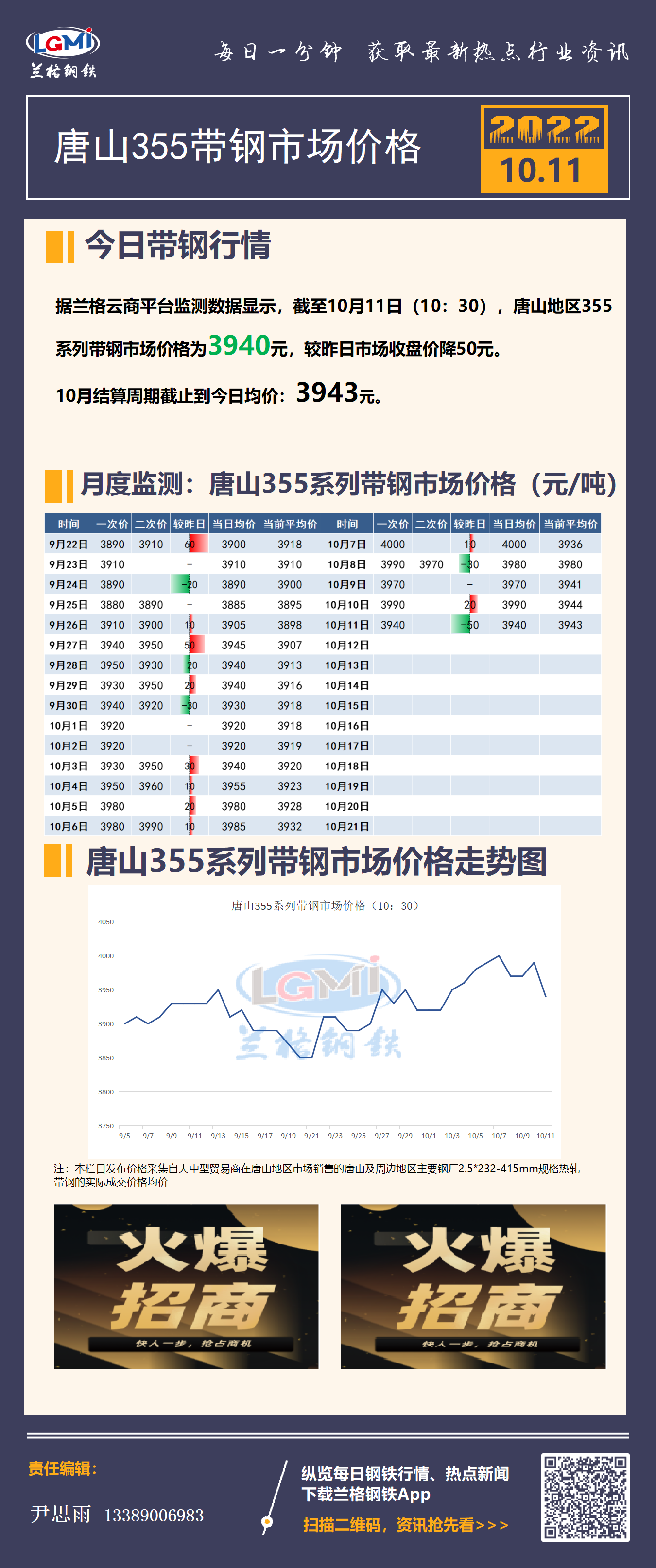 - 10月11日(10:30)唐山355系带钢市场价格2022/10/11