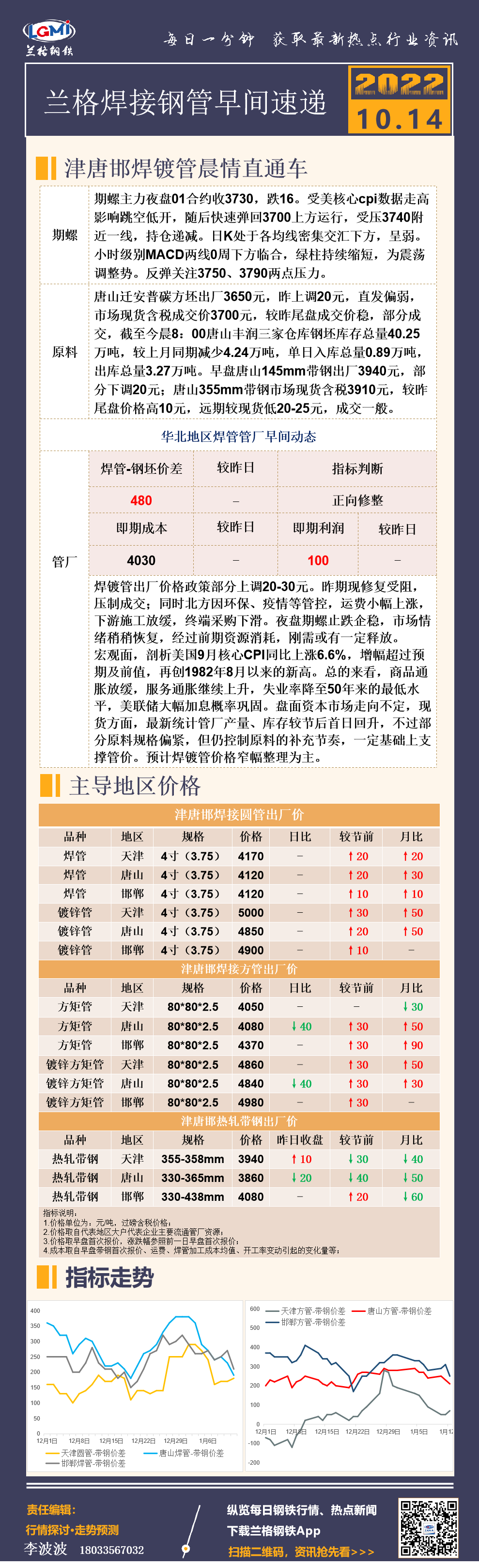 10月14日(9:20)兰格津唐邯焊接钢管早间速递