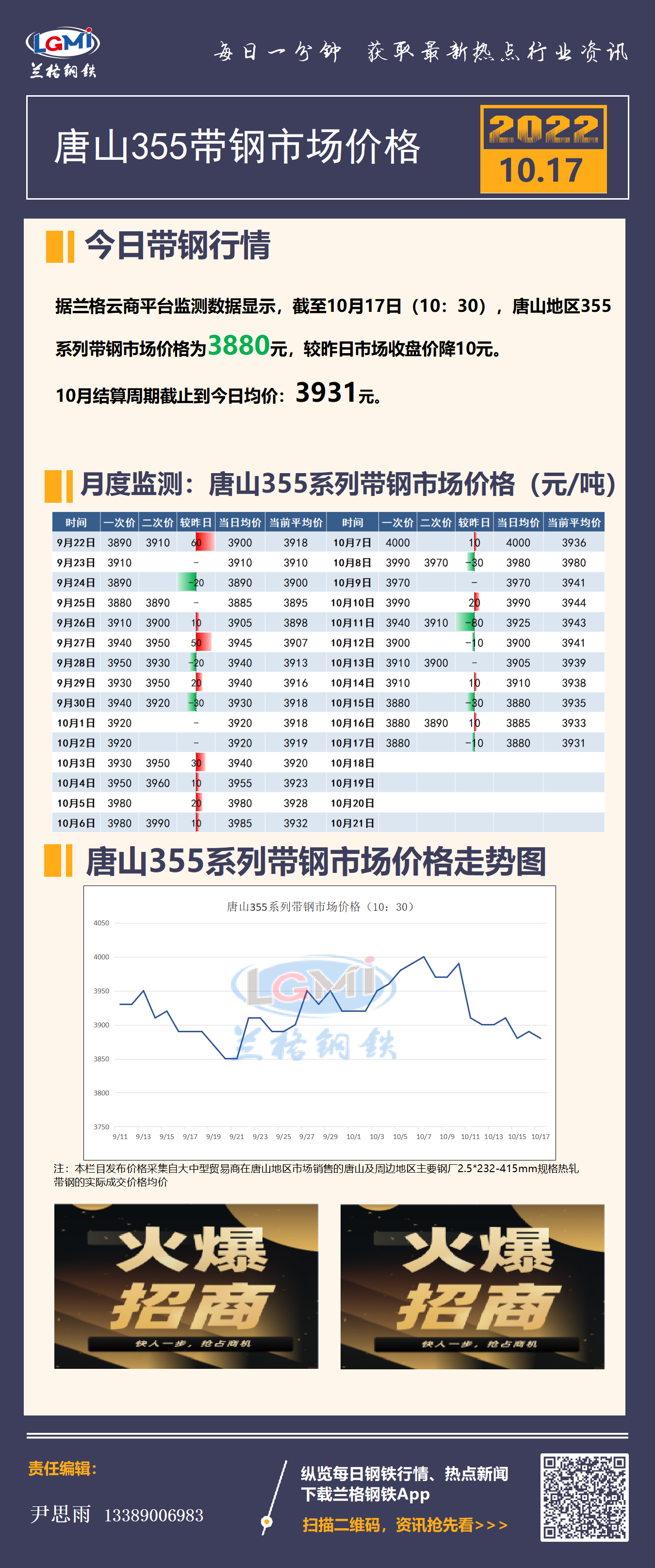 - 10月17日(10:30)唐山355系带钢市场价格2022/10/17