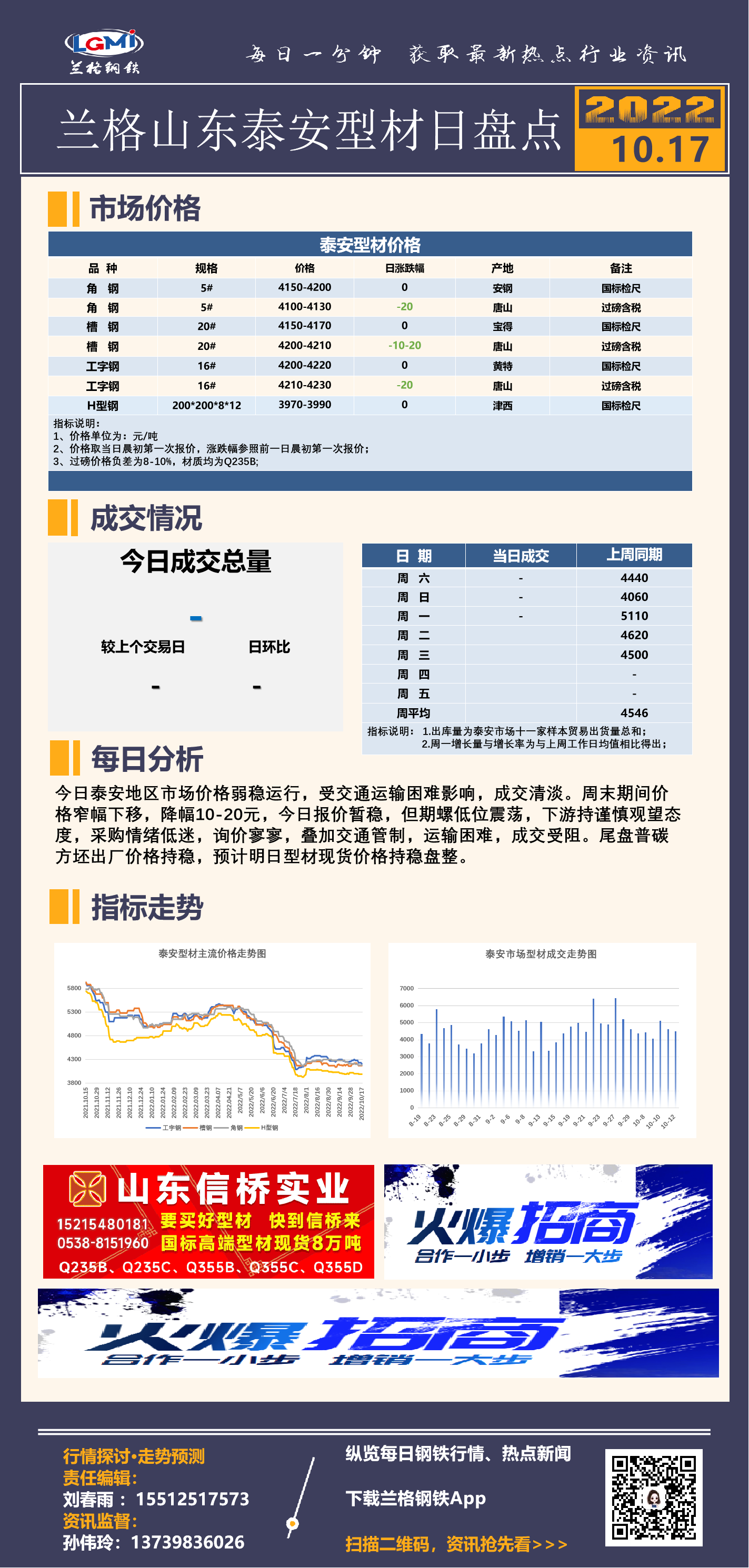 - 泰安型材日盘点:价格弱稳运行 期螺低位震荡 成交寥寥2022/10/17