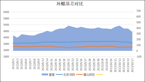 坯螺价差:以北京市场为例,10月17日河钢螺纹基价3980元与钢坯3650元基差为330元,较上个交易日减小60元。