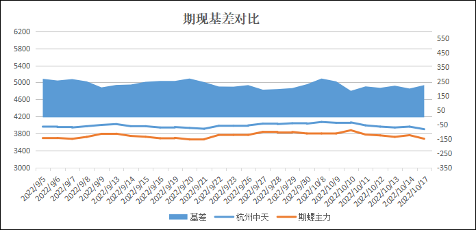 期现基差:以杭州市场为例,10月17日中天螺纹基价3900元与主力期螺收盘3675元基差为225元,较上个交易日增大24元。