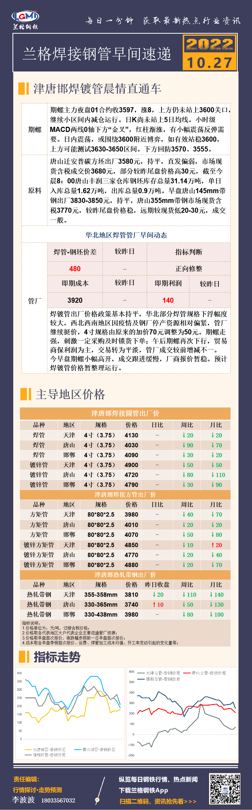 10月27日(9:20)兰格津唐邯焊接钢管早间速递