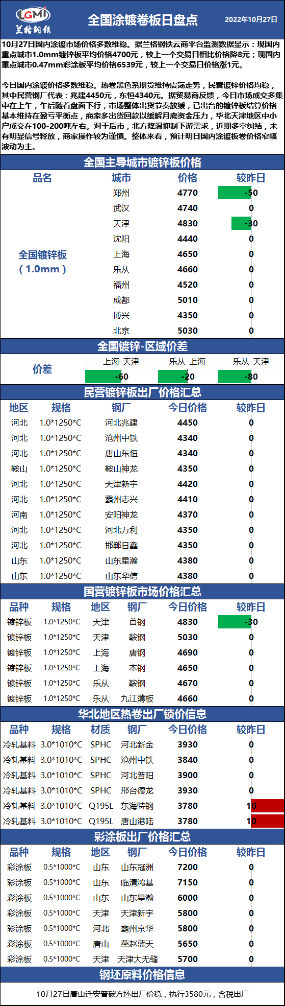 - 10月27日全国钢厂建筑钢材调价汇总2022/10/27