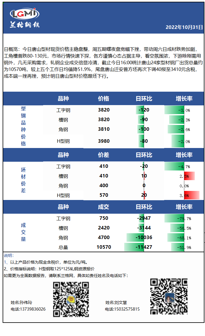 - 10月31日(9:30)唐山型材厂H型钢实时调价汇总2022/10/31