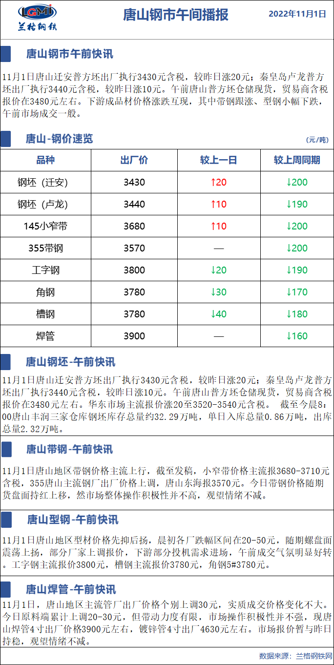 11月1日兰格唐山钢市午间播报