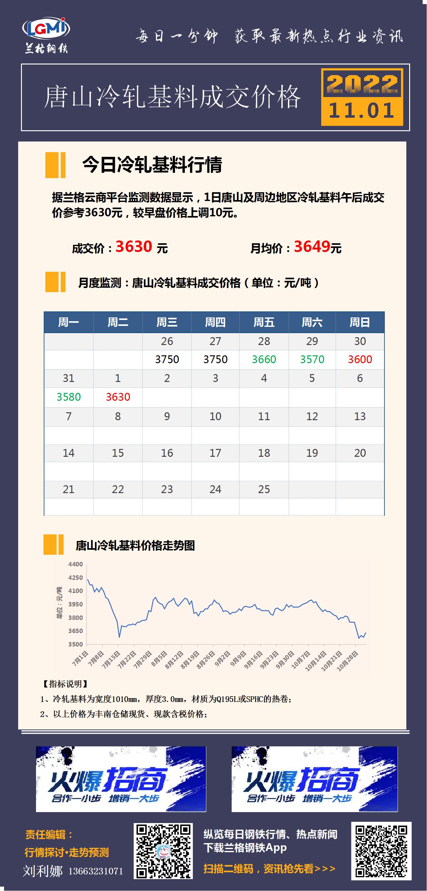 11月1日唐山冷轧基料成交价格