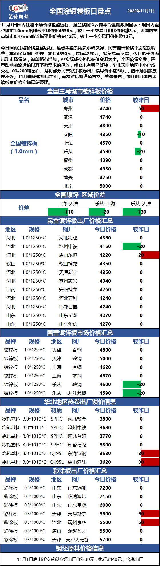 - 11月01日全国钢厂建筑钢材调价汇总2022/11/1