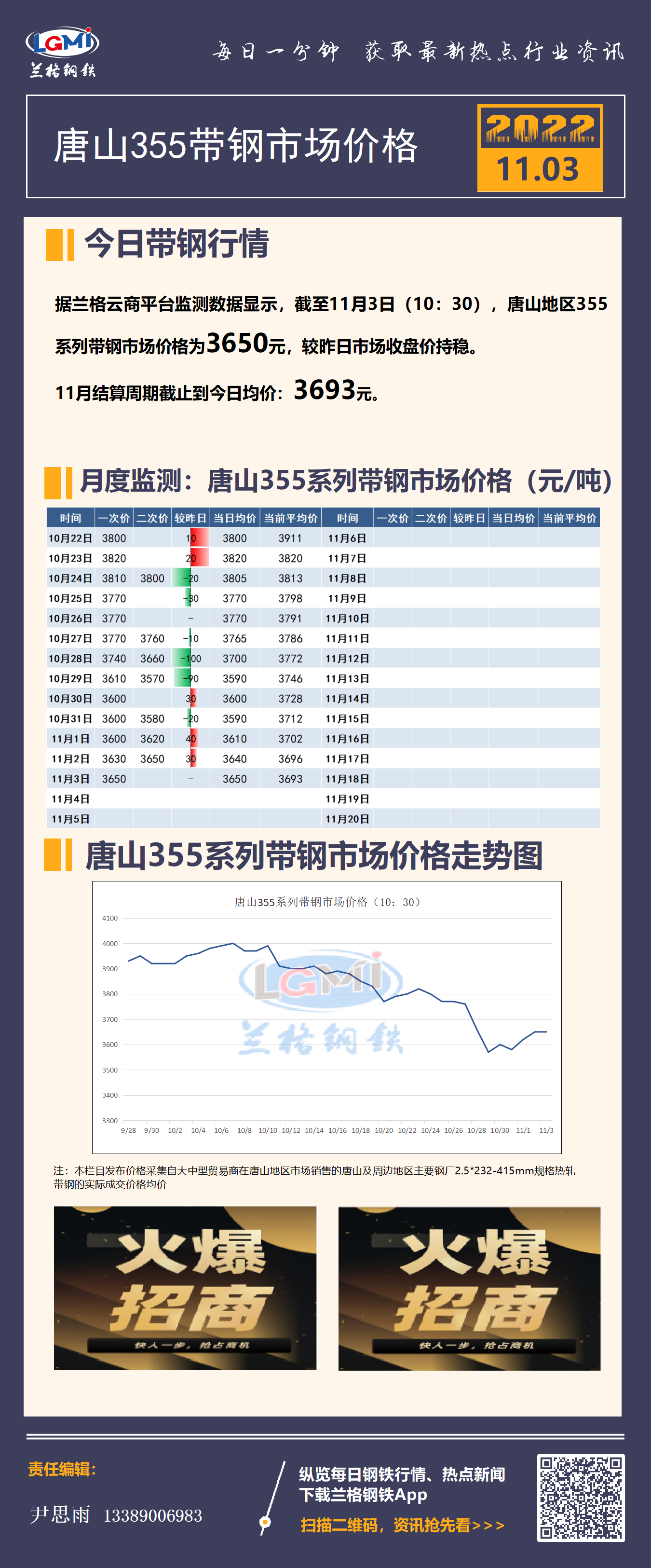 - 11月3日(10:30)唐山355系带钢市场价格2022/11/3