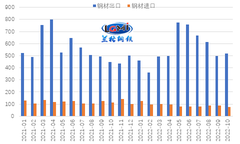 进口方面,10月份进口钢材环比明显收缩,较9月份减少11.9万吨,环比下降13.4%。