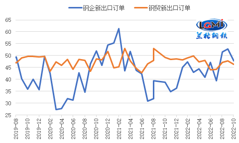 从出口订单来看,海外制造业下行压力已波及我国钢材出口订单指数,10月份我国钢铁业新出口订单明显回落,其中,中物联钢铁物流专业委员会调查的钢铁企业新出口订单指数回落5.1个百分点,至47.7%,再次回落至收缩区间;兰格钢铁网调研的钢铁流通企业新订单指数回落1.4个百分点,至46.4%。