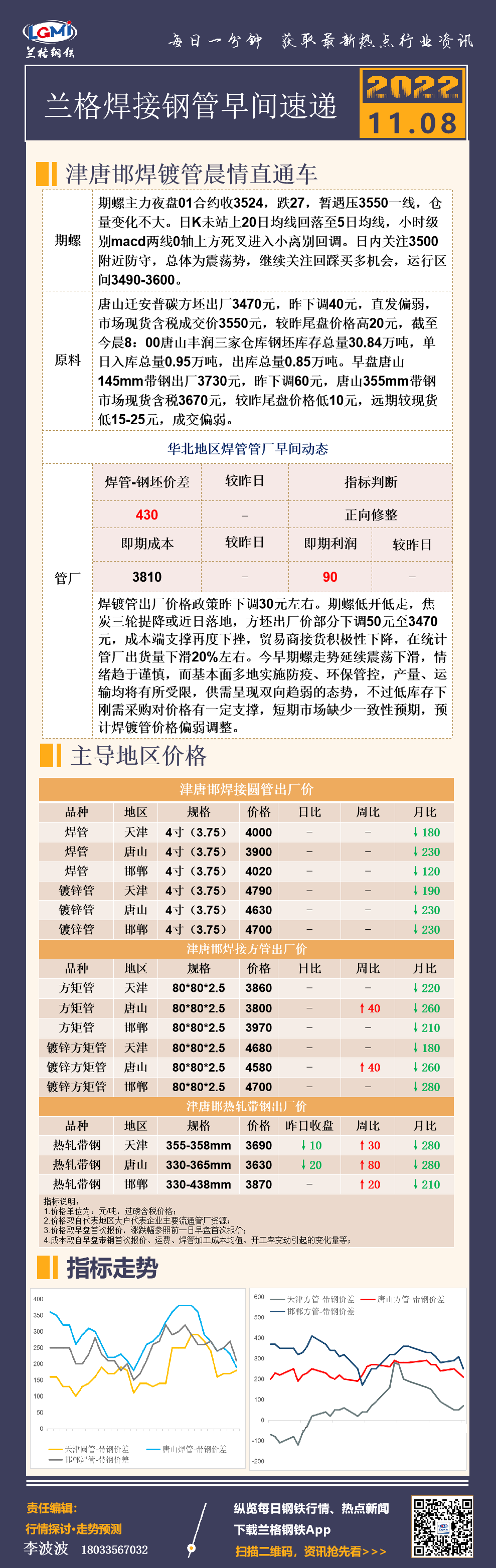 11月8日(9:20)兰格津唐邯焊接钢管早间速递