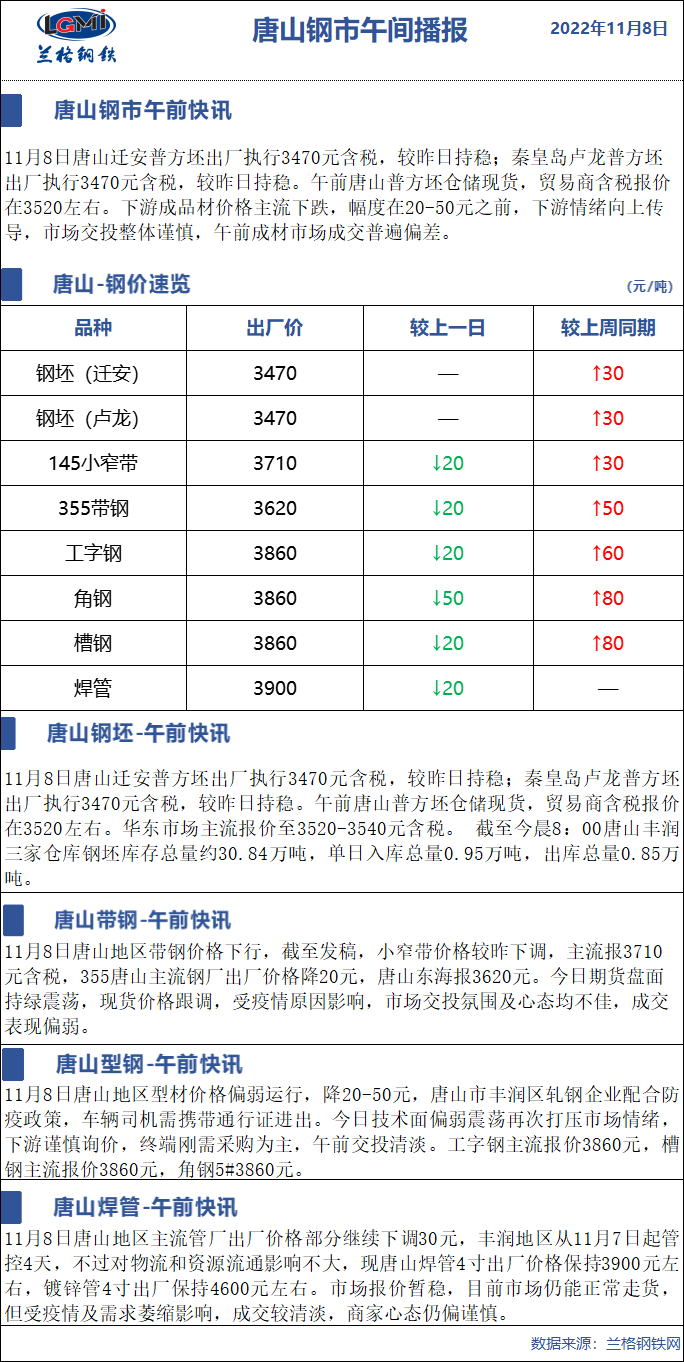 11月8日兰格唐山钢市午间播报