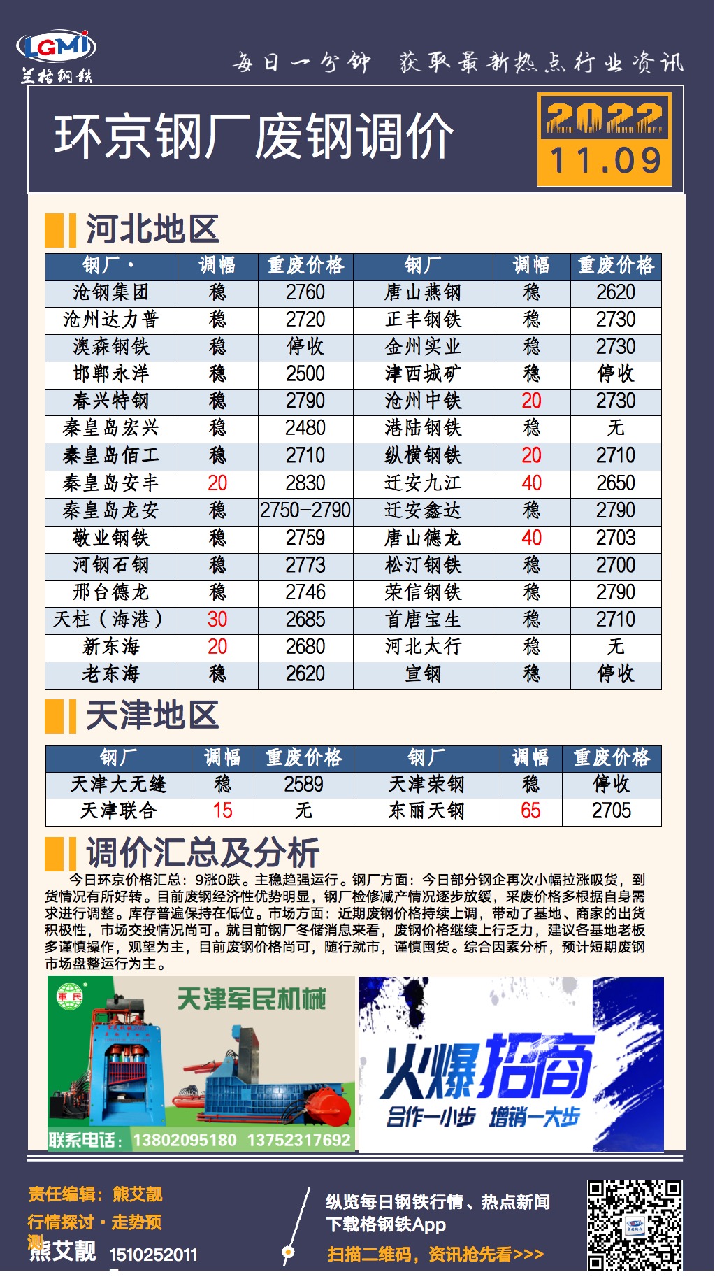 - 11月9日兰格钢铁网废钢流通基准价格指数2461涨22022/11/9