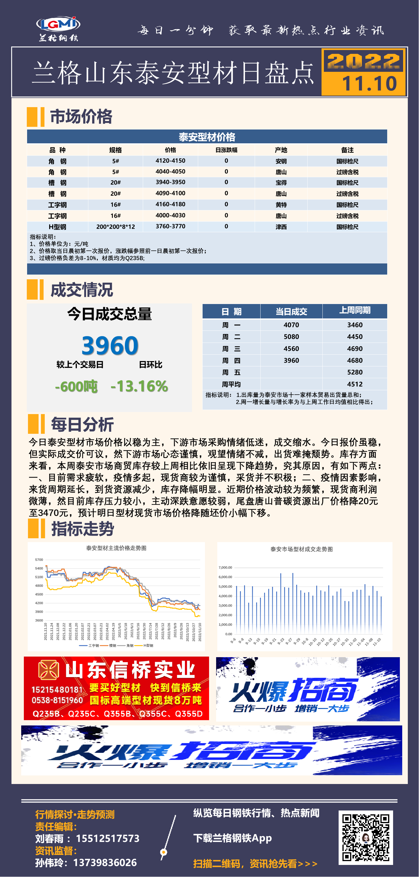 - 泰安型材日盘点:价格持稳盘整 成交萎靡2022/11/10