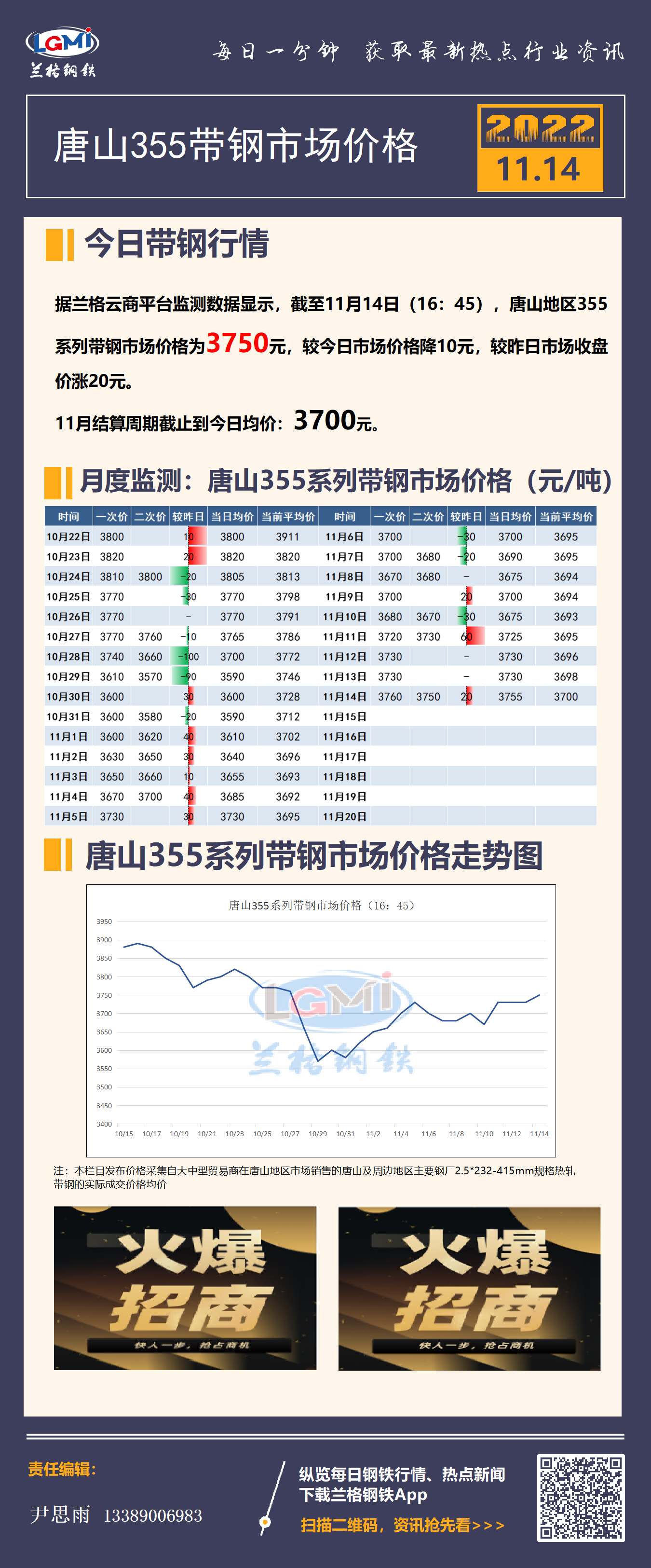 - 11月14日(16:45)唐山355系带钢市场价格2022/11/14