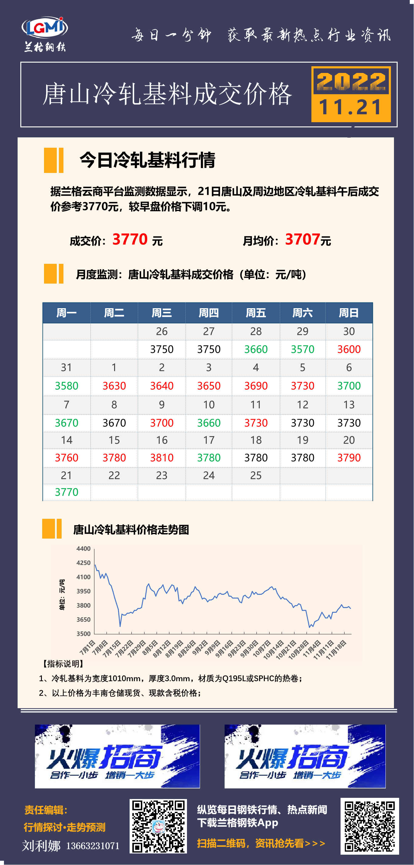 11月21日唐山冷轧基料成交价格