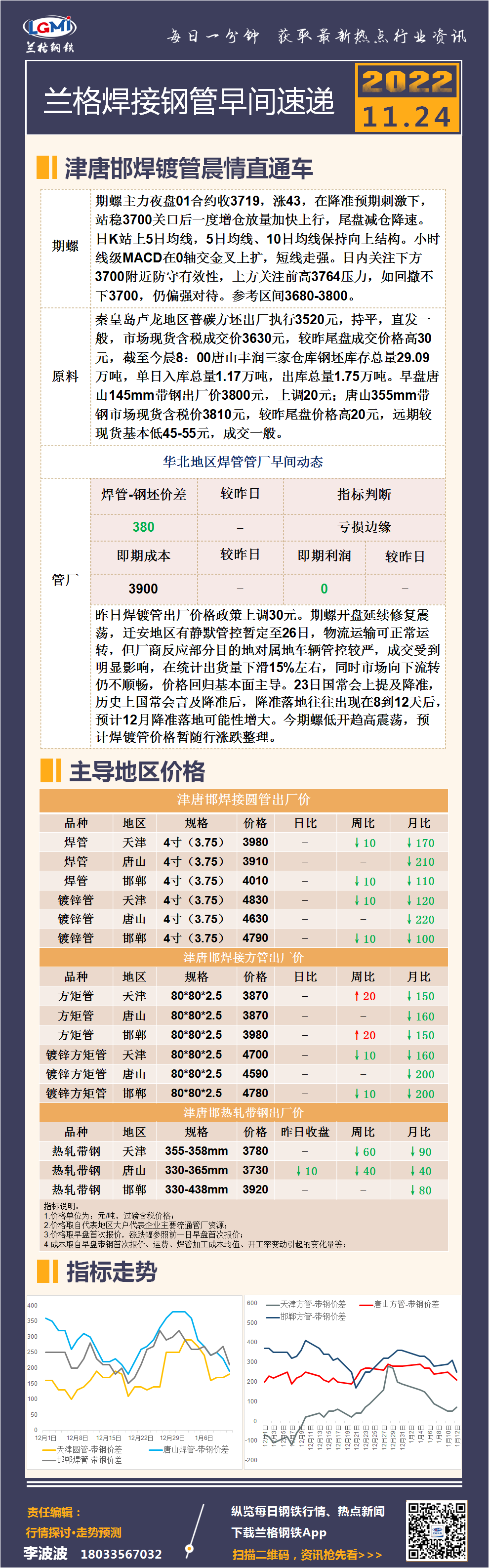 11月24日(9:20)兰格津唐邯焊接钢管早间速递