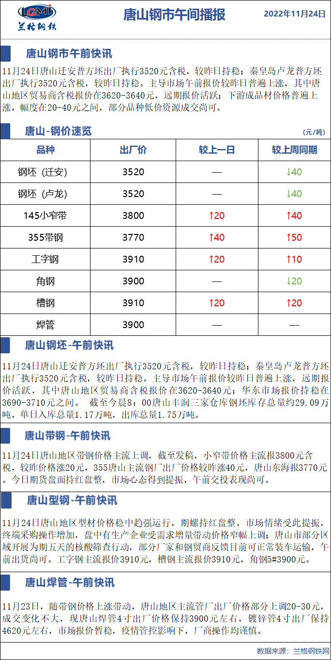 - 11月24日唐山津西钢铁带钢出厂价格涨30元2022/11/24