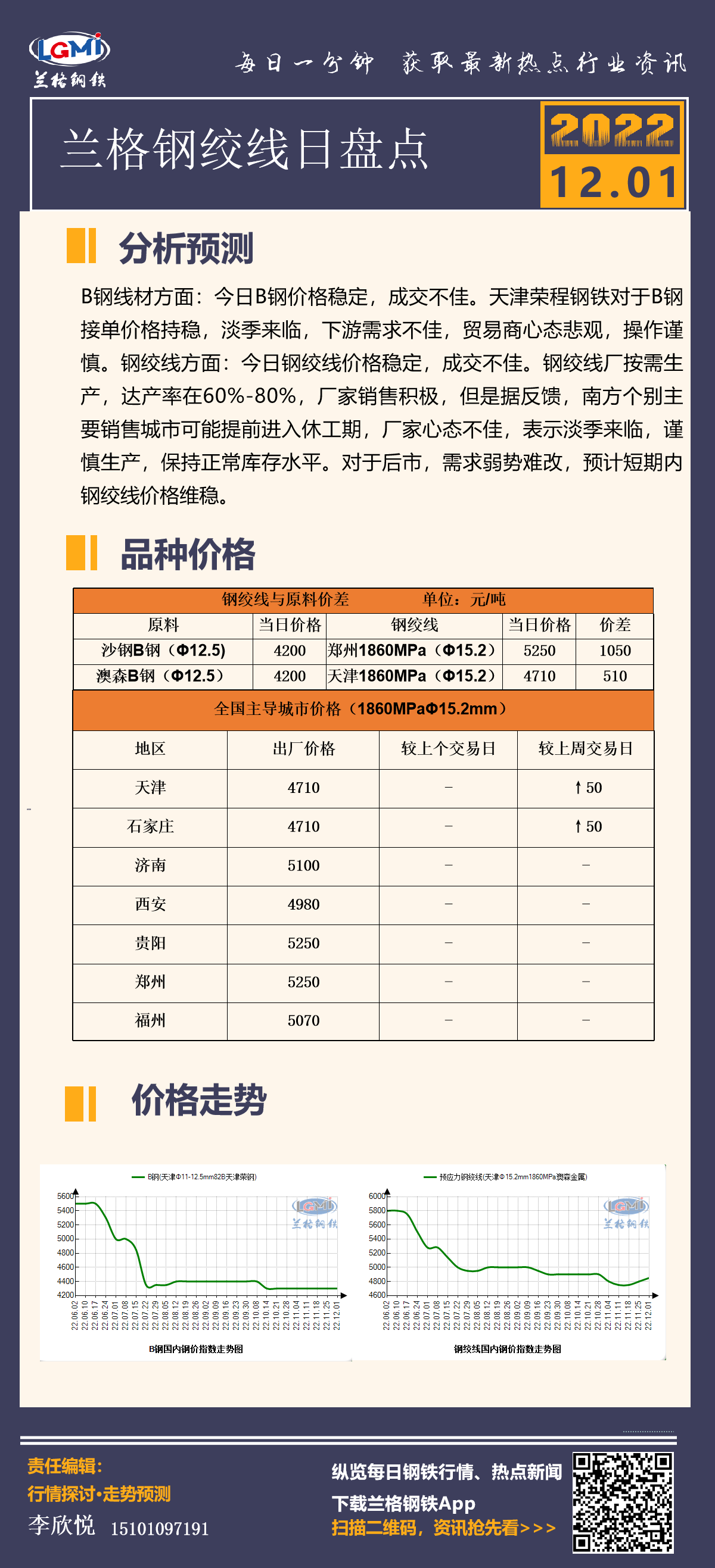 - 12月1日天津荣程钢B钢线材接单价格稳2022/12/1