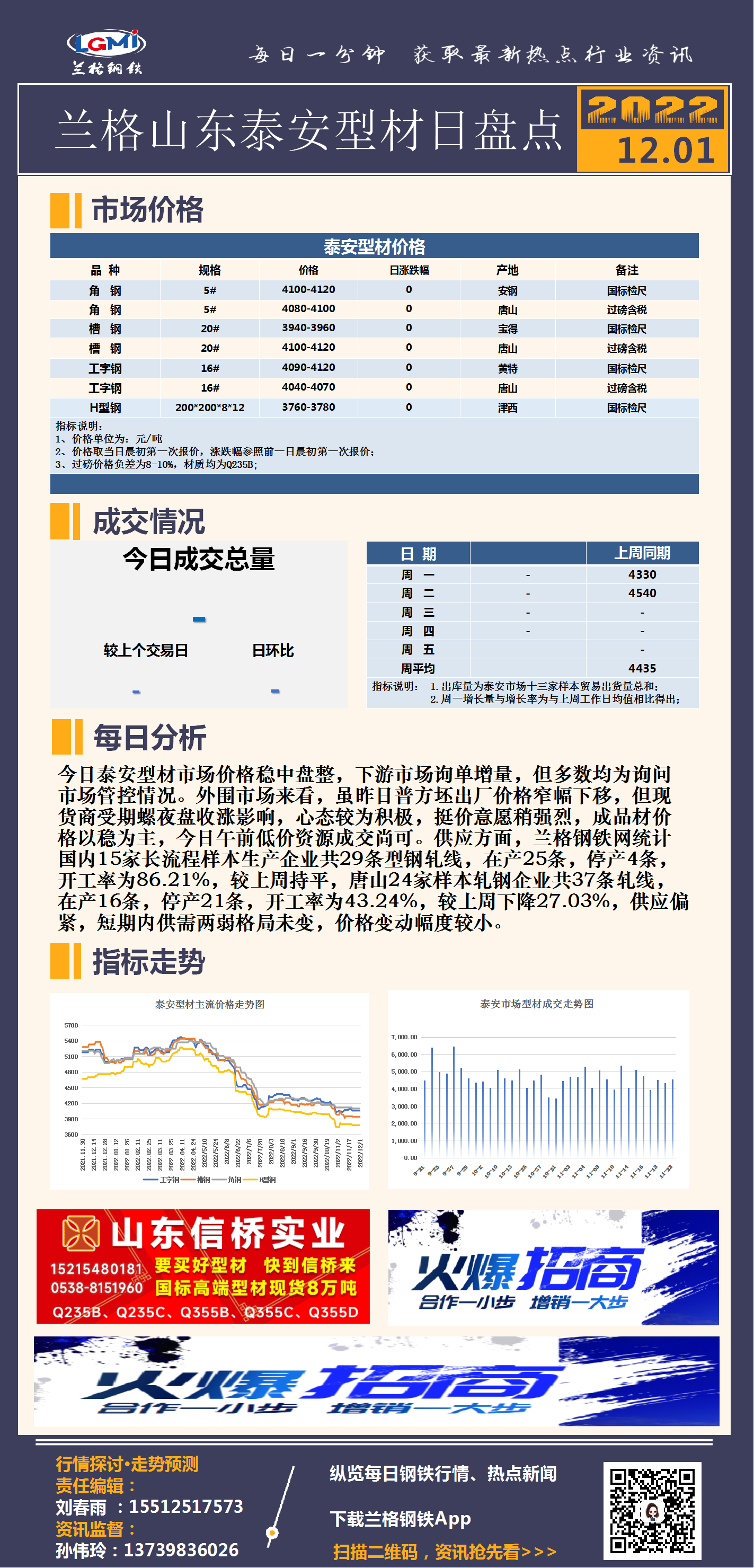 - 泰安型材日盘点:价格盘整 低价资源成交尚可2022/12/1