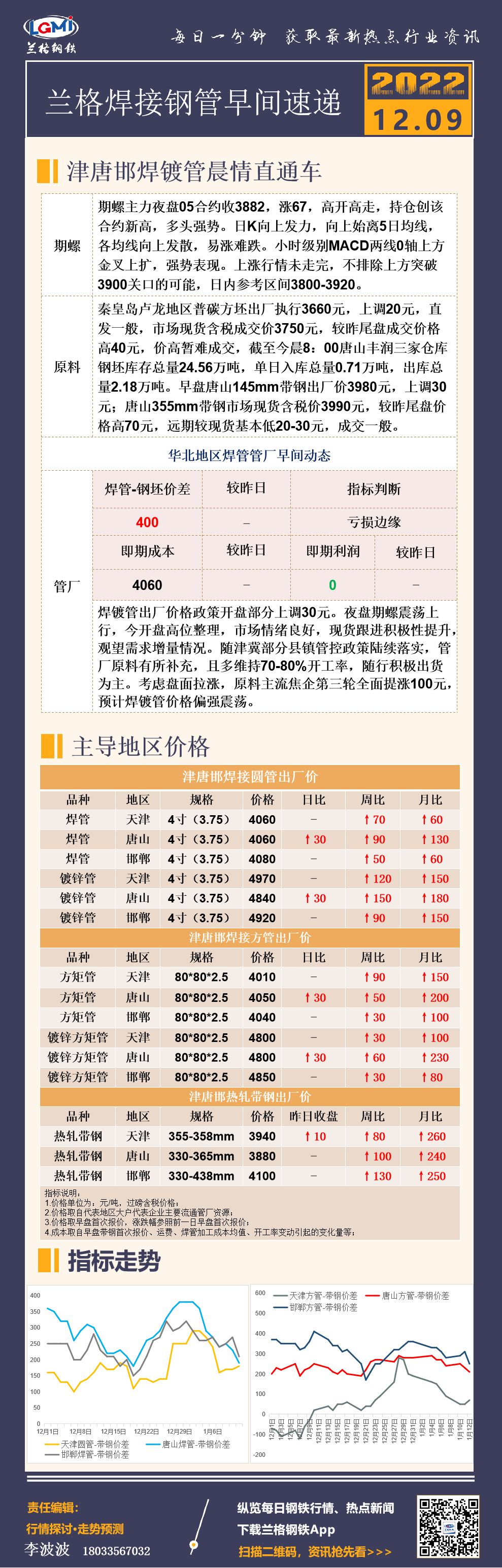 12月9日(9:20)兰格津唐邯焊接钢管早间速递