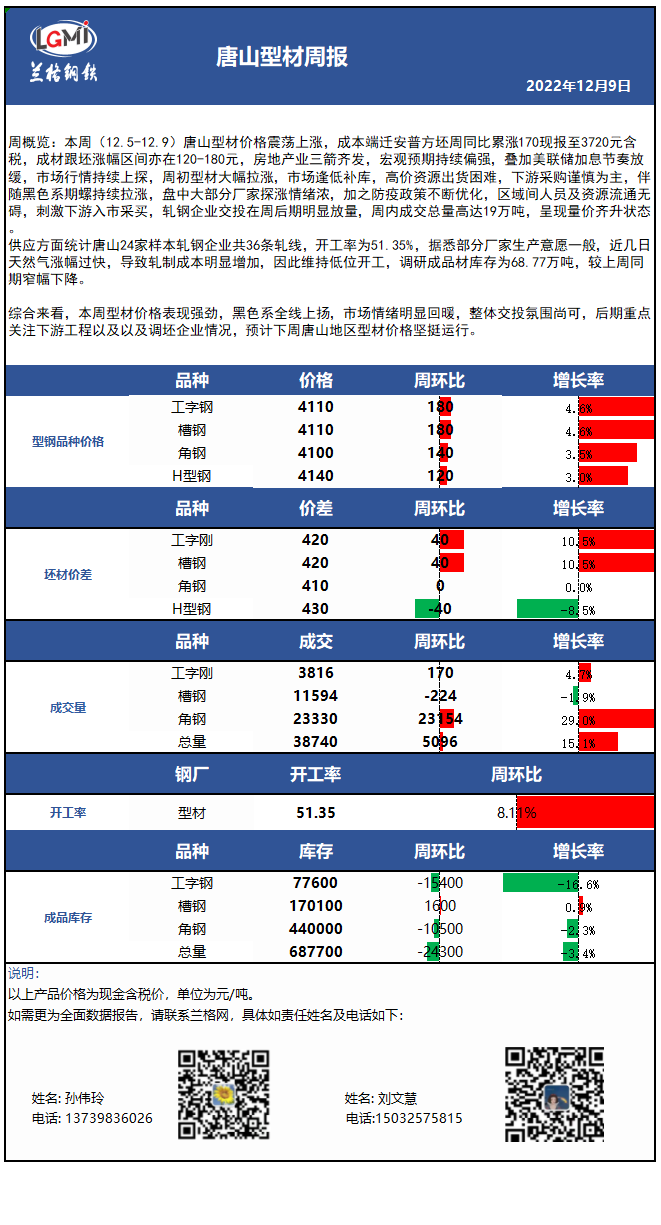 - 唐山型材周盘点:成材涨幅120-180元 轧钢企业周后期交投放量2022/12/9