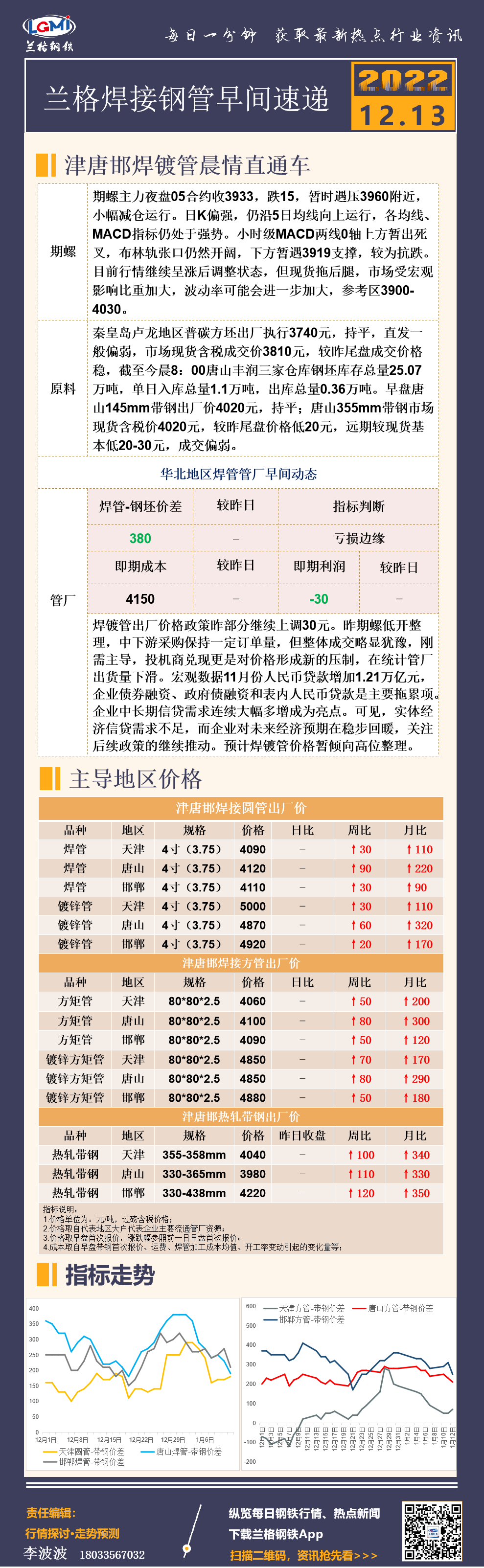 12月13日(9:20)兰格津唐邯焊接钢管早间速递