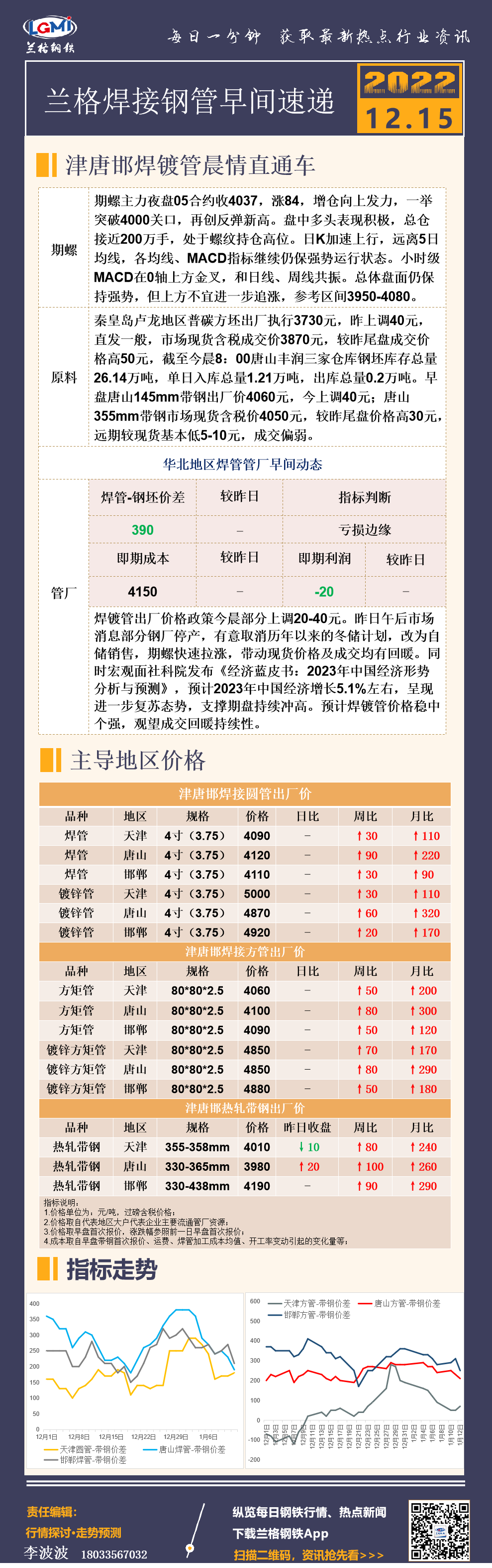 12月15日(9:20)兰格津唐邯焊接钢管早间速递