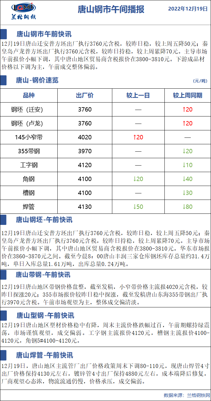 - 12月19日山西晋南钢铁建筑钢材出厂价格平稳2022/12/19
