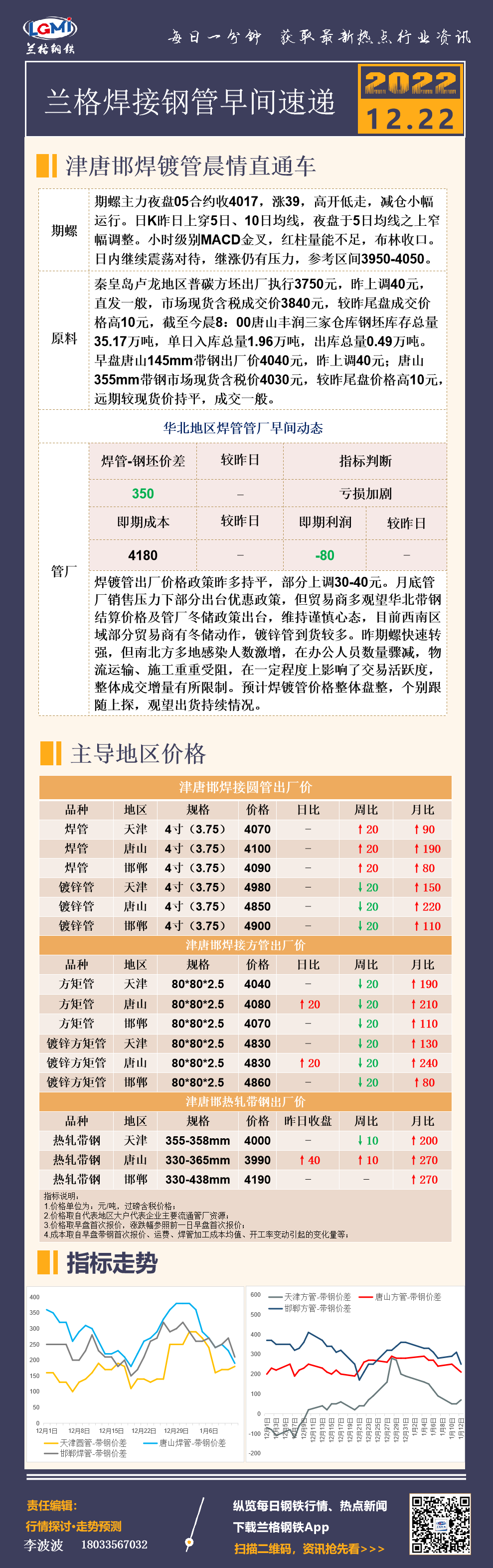 12月22日(9:20)兰格津唐邯焊接钢管早间速递