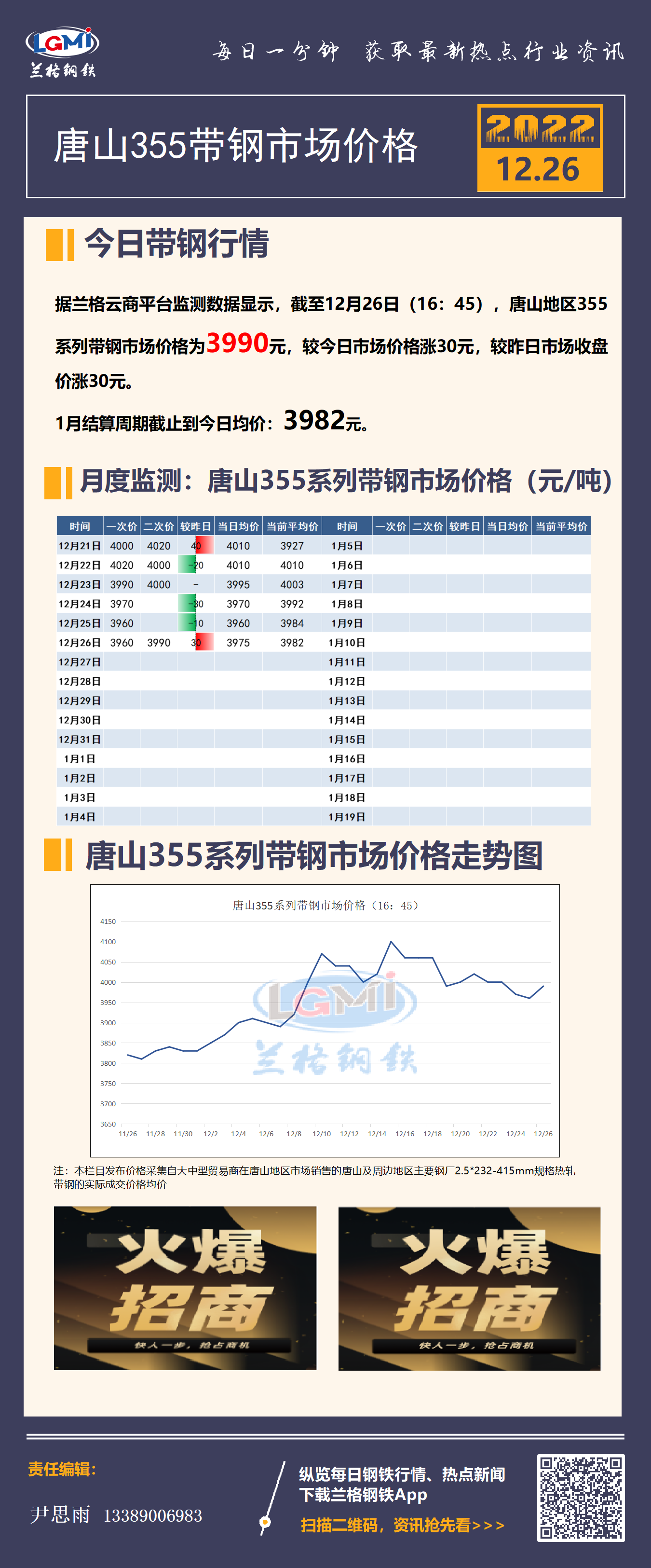 - 调价:12月26日唐山东海带钢出厂价格再涨20元2022/12/26