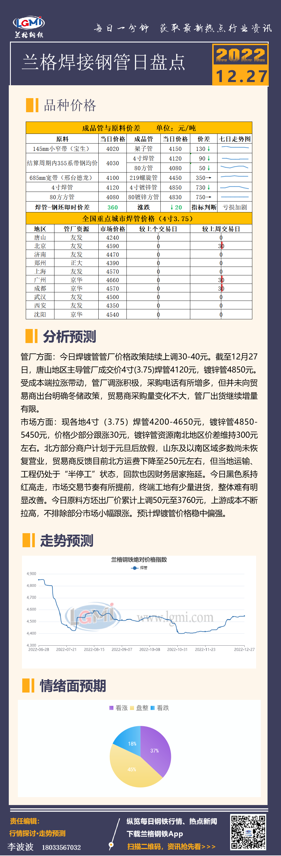 - 兰格焊管日盘点:期货持红引导 现货抬价氛围提升2022/12/27