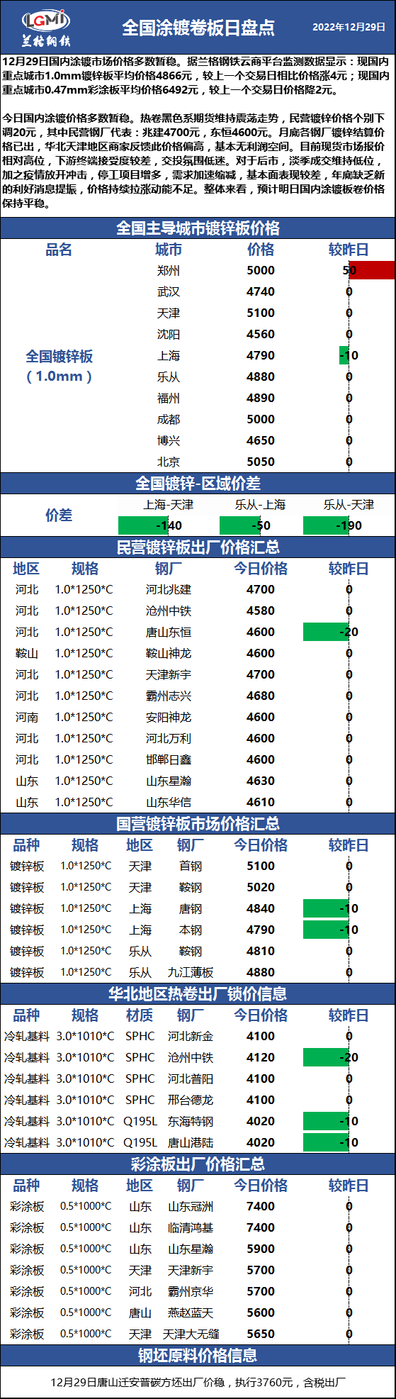 兰格涂镀板卷日盘点:涂镀价格多数暂稳 交投氛围低迷