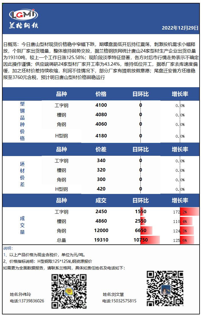 - 唐山型材日盘点:成材稳中窄幅下跌 期盘持红部分调坯厂成交增量2022/12/29