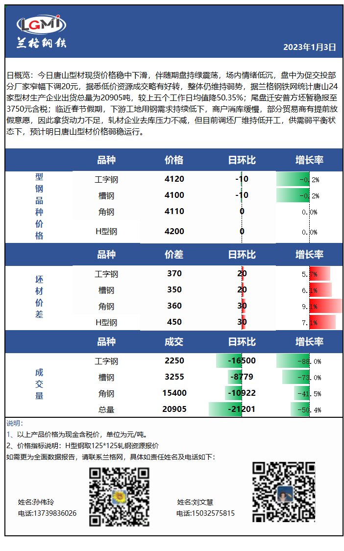 - 1月3日(9:30)唐山型材厂槽钢实时调价汇总2023/1/3