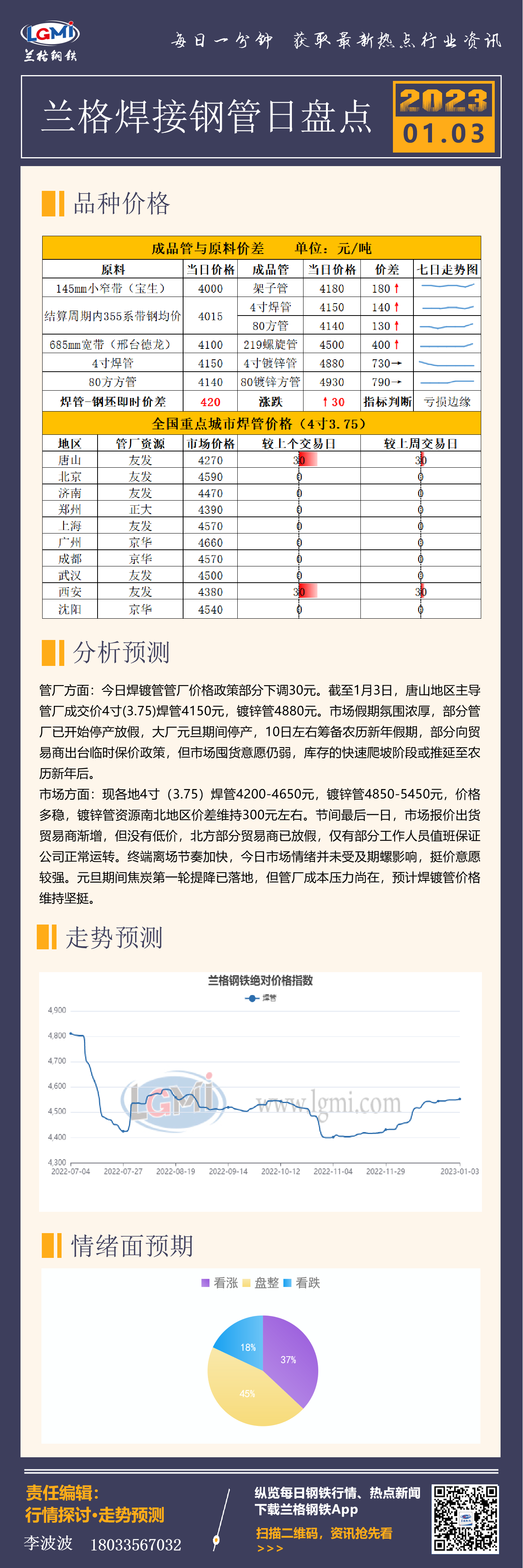 - 兰格焊管日盘点:情绪脱离盘面 管厂商价格维持坚挺2023/1/3