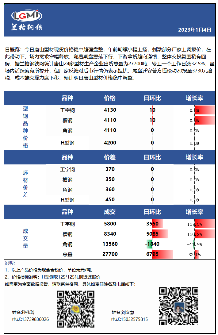 - 收评:今日唐山型材价格主稳个涨,下游补库需求部分释放,出货回暖2023/1/4