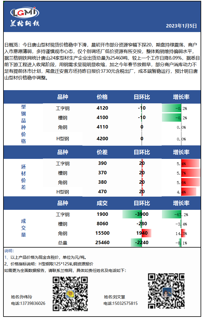 - 唐山型材日盘点:成材主稳部分资源窄幅回落 场内购销谨慎2023/1/5