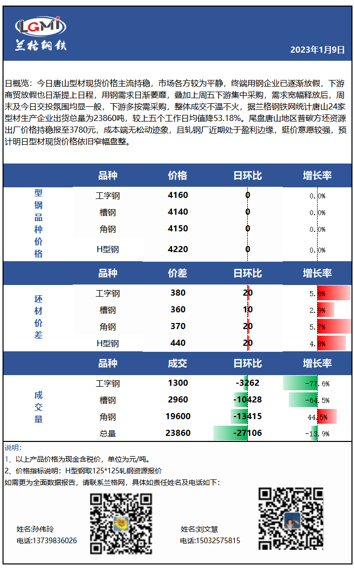 - 收评:今日唐山型材价格主流持稳,临近春节现货需求收缩,市场交投清淡2023/1/9