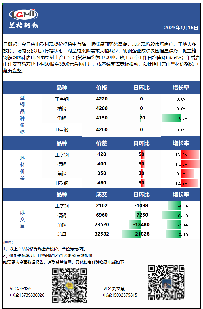 - 收评:今日唐山型材价格弱稳运行,刚需采购显著收缩,成交清淡2023/1/16