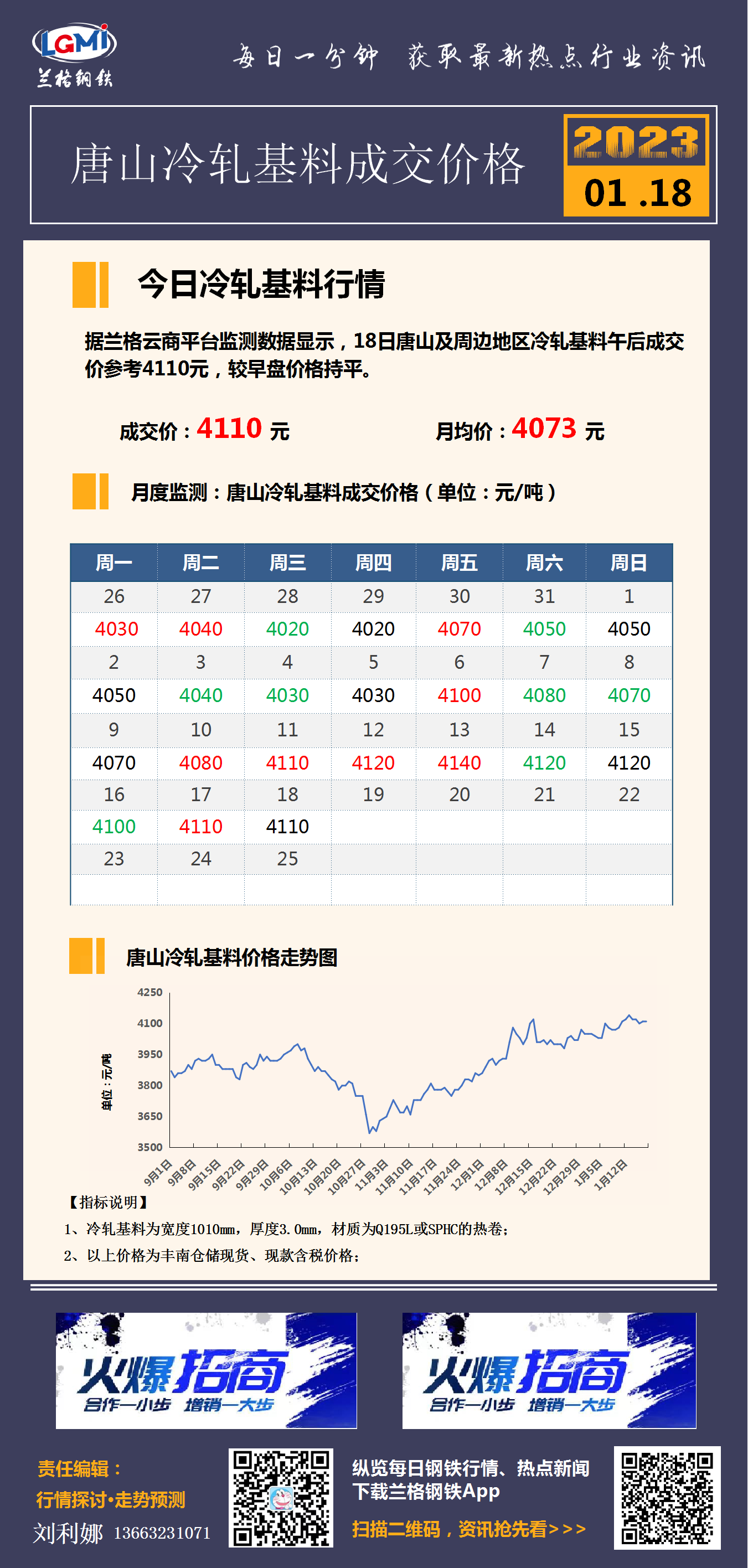 - 1月18日唐山津西钢铁带钢出厂价格涨20元2023/1/18