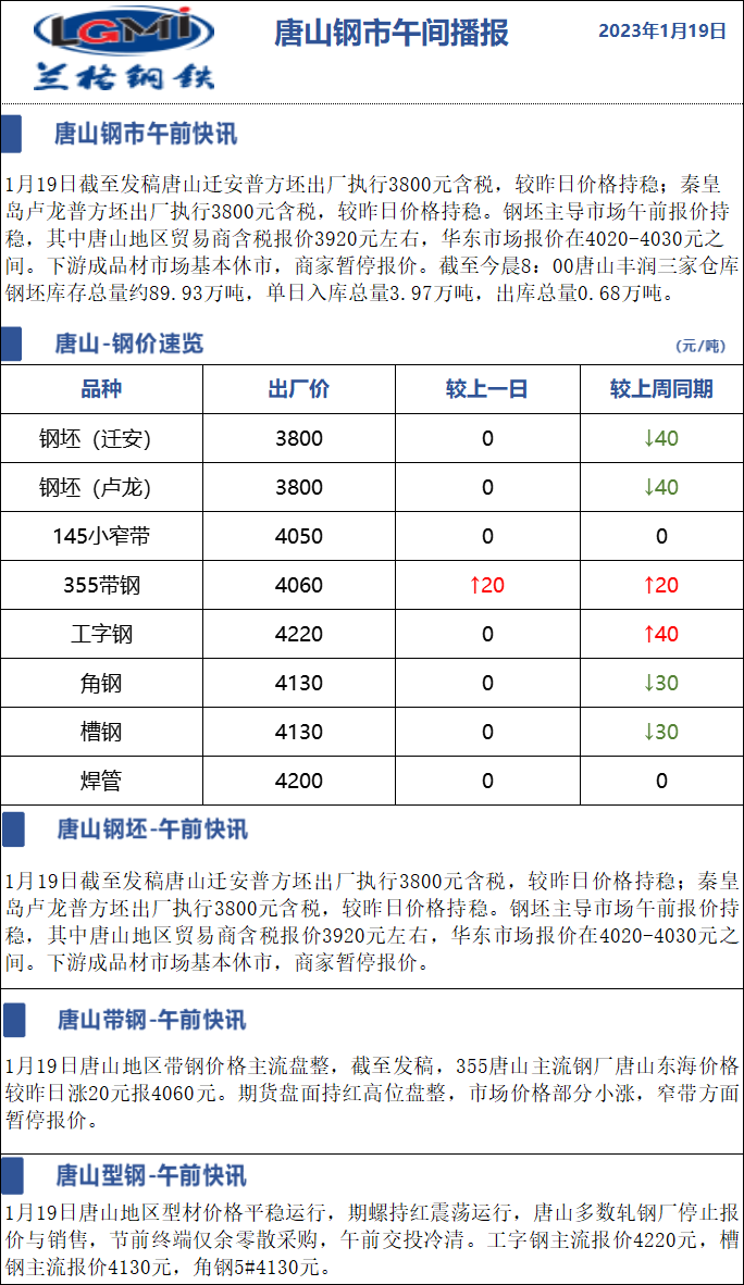 - 1月19日唐山津西钢铁带钢出厂价格稳2023/1/19